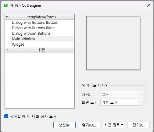 1.3 Main Window 를 클릭 후 "생성" 버튼 클릭!