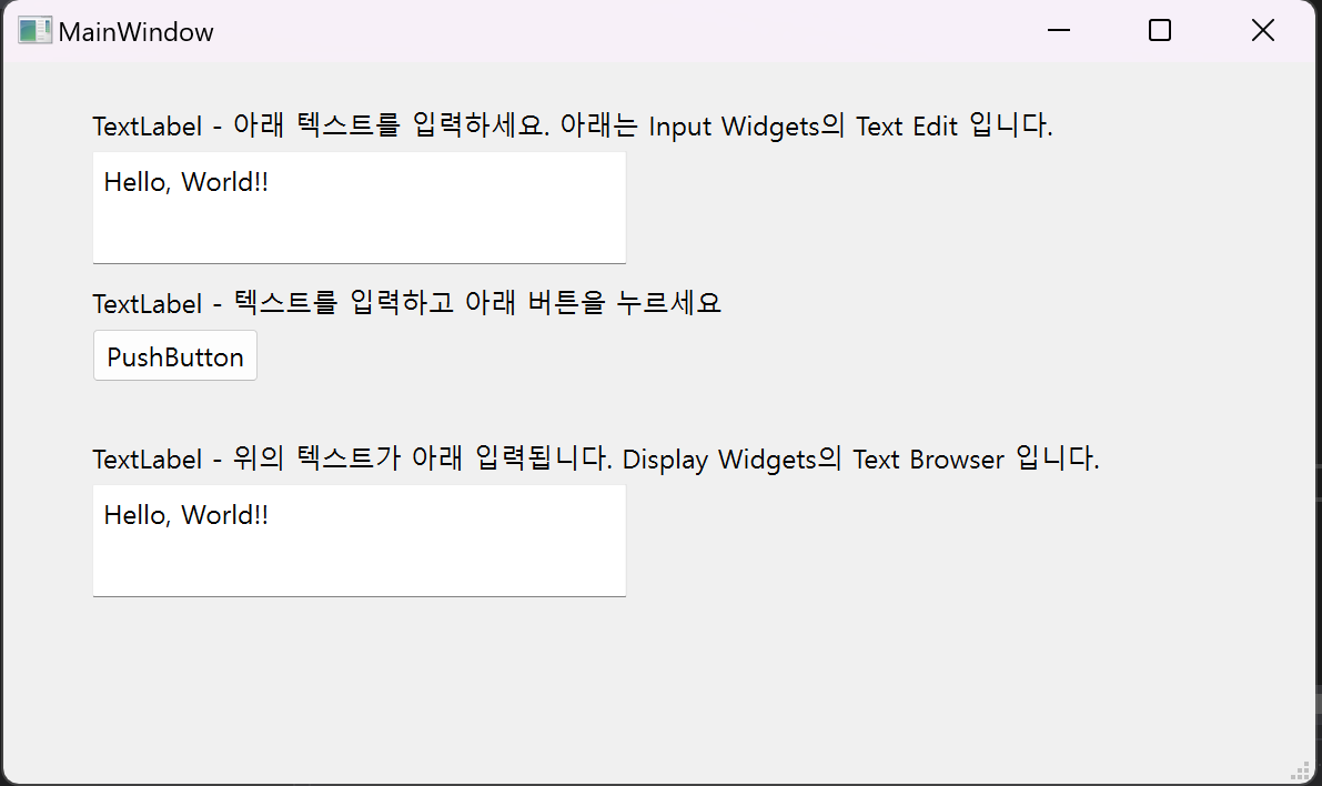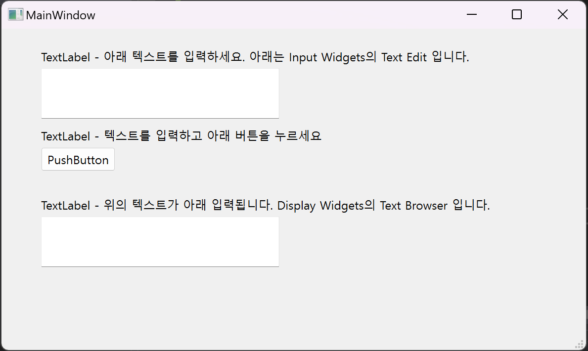 self.label_2.setText(_translate("MainWindow", "TextLabel - 위의 텍스트가 아래 입력됩니다. Display Widgets의 Text Browser 입니다."))