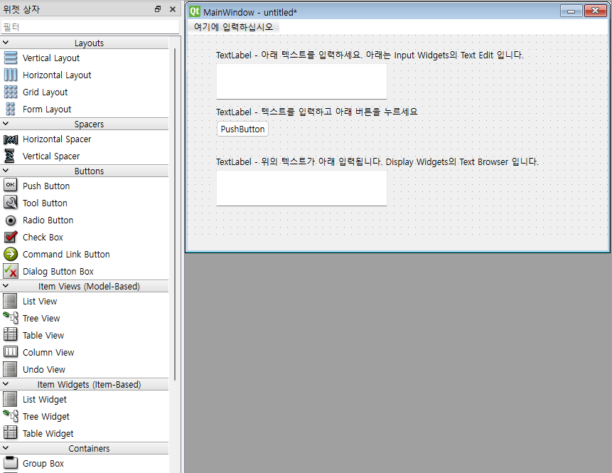 self.label.setText(_translate("MainWindow", "TextLabel - 아래 텍스트를 입력하세요. 아래는 Input Widgets의 Text Edit 입니다."))