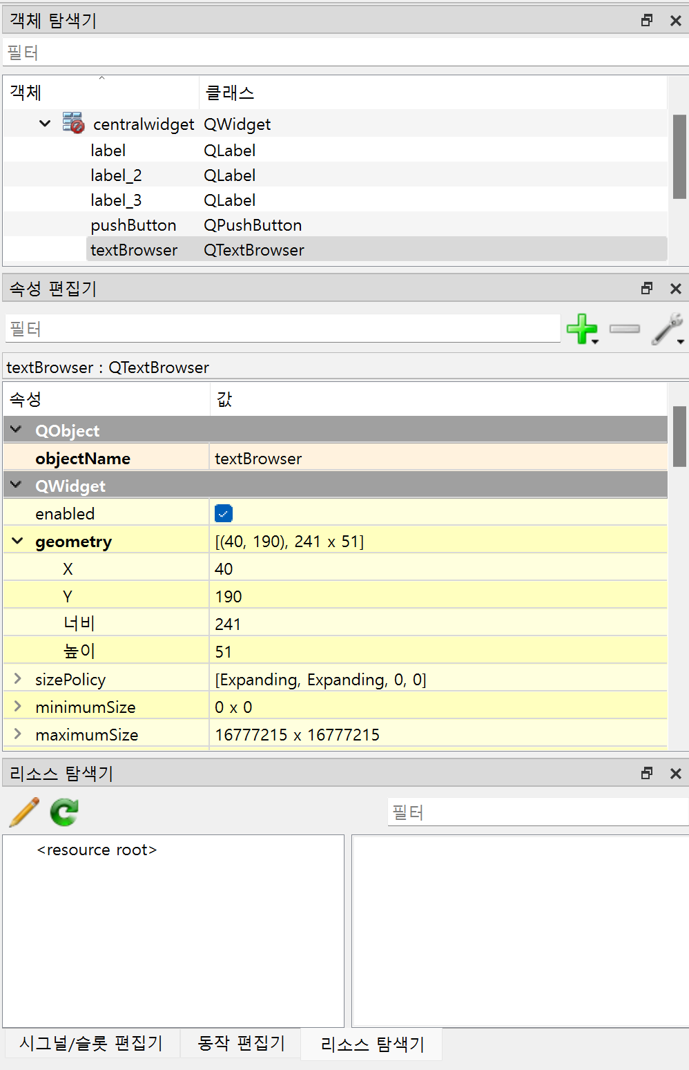 MainWindow, push button 등 크기는 마우스로 직접 수정도 가능하고 각 위젯을 클릭했을 때 우측에 QWidget 항목 중 geometry를 이용하면 원하는 위치 및 크기를 설정할 수 있습니다.(아래 스크린샷)